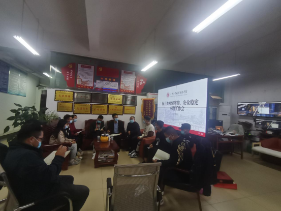 为积极响应教育厅“三统筹”工作视频会及清镇校区疫情防控与安全稳定工作调度会关于“开展安全大排查”的要求,2022年10月7日下午,保卫处在悦知楼办公室召开疫情防控、安全稳定专题工作会,会议由保卫处副处长黄宗正主持,保卫处值守老师、保安队队长以及自律委员会、国际护卫队、消防协会负责同学参与会议,审计处处长谢洪旭和实训中心主任谯顺彬受邀参加会议并讲话。