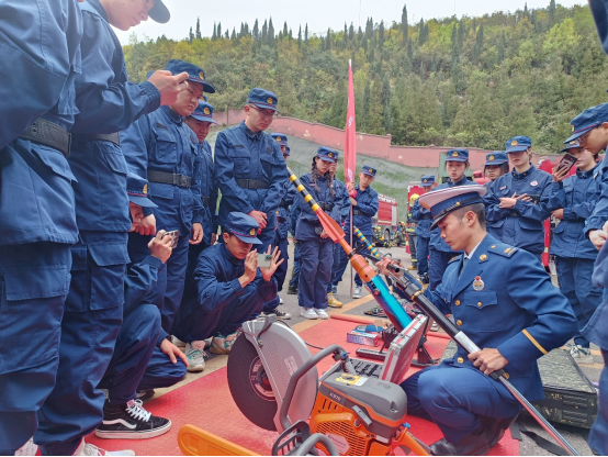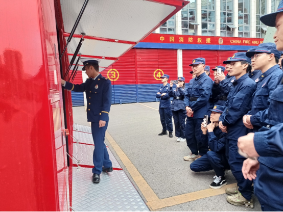 消防讲解员以现场观摩的方式,详细介绍了防护服、消防头盔、氧气瓶氧气罩、电锯、消防车、高压水枪、消防防坠落装备以及如何破开防道门等内容,让同学们直观、真实地了解消防救援器材的使用方式。