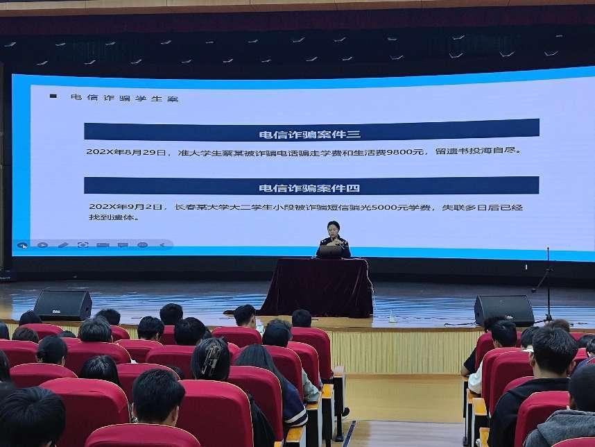 为进一步提高师生应对各类电信网络诈骗的鉴别能力和自我防范意识,学院党委保卫工作部于2023年10月17日下午14时,邀请到马王派出所警官李欢和中国民生银行股份有限公司贵阳分行徐宁等人在道德讲堂为师生开展防电信网络诈骗宣传讲座。