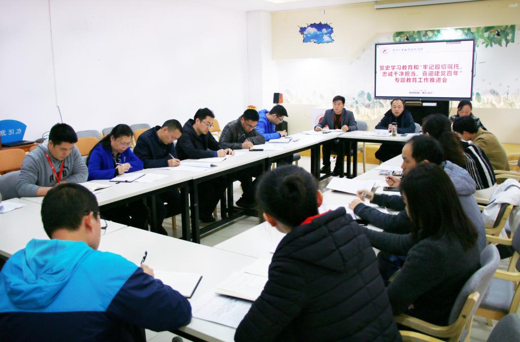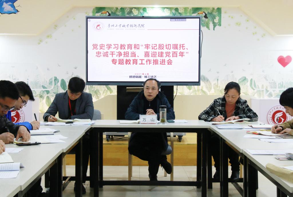 2021年4月12日,我院在清镇校区学生事务中心召开党史学习教育和“牢记殷切嘱托、忠诚干净担当、喜迎建党百年”专题教育工作推进会,传达学习全省教育系统宣传工作思想暨意识形态工作联席会议、省属本科高校、厅属职业院校党委组织部长、统战部长工作会议精神,安排部署近期学院党史学习教育和专题教育工作。学院党委副书记万山主持会议并作工作部署。